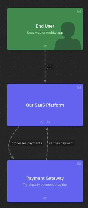 This is the top level view where we see the users, our saas platform and the payment gateway: