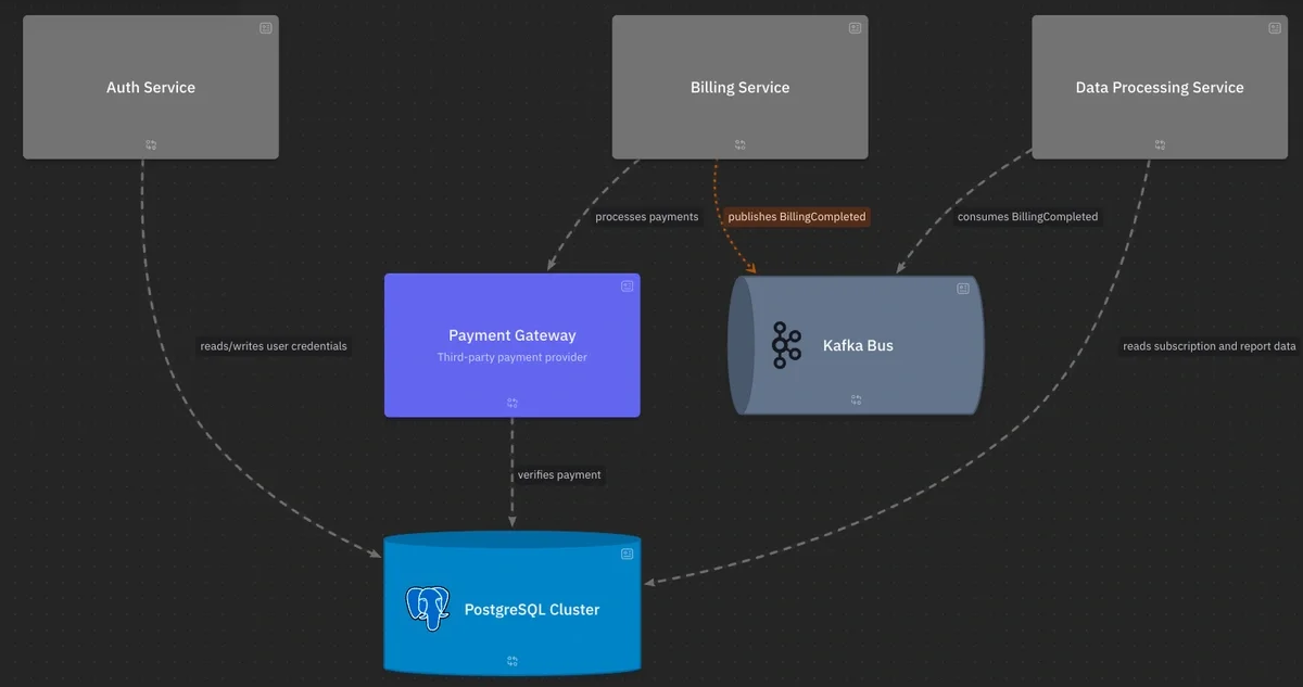 It builds on the ideas of the C4 Model (Context → Container → Component → Code) but offers more flexibility: you define your own element kinds and arbitrary nesting levels.