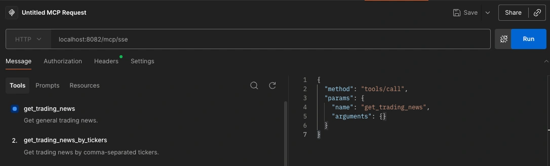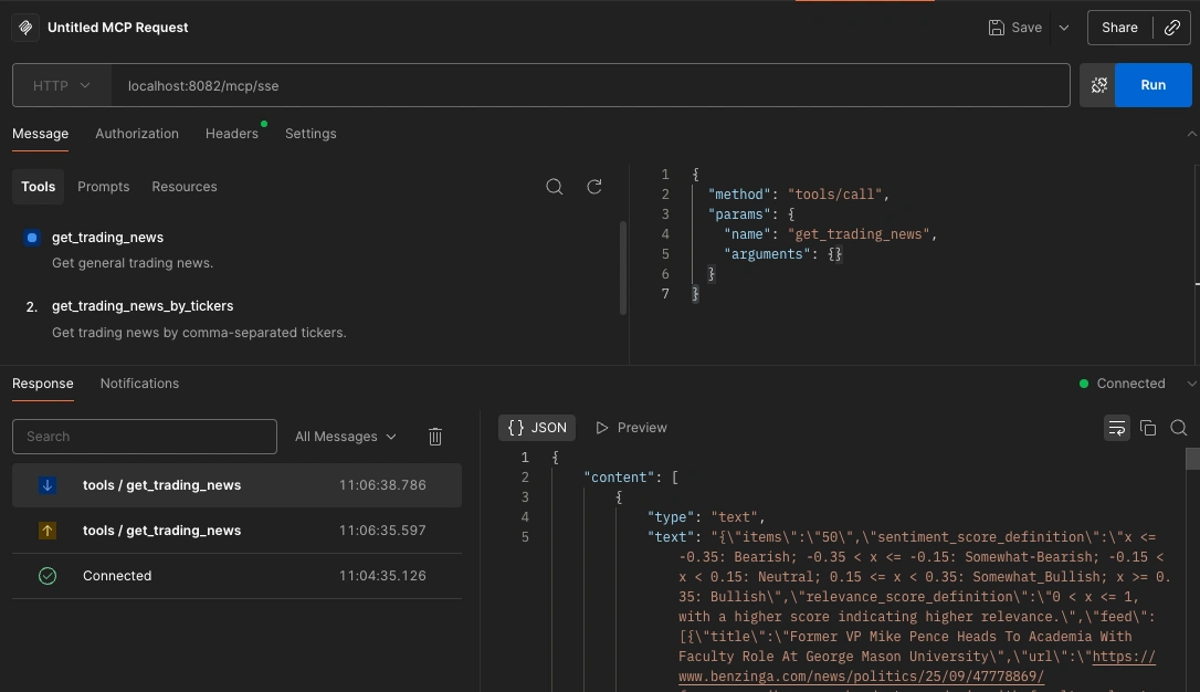 Once connected, the AI assistant will discover your tools automatically and can call them when users ask for trading news.